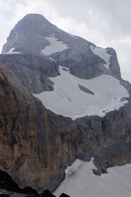 Lástima del gallinazo que hay hoy pero, fíjate simplemente en la faja bajo el Hombro (por la que se accede a la Gruta Devaux) o en las rampas que se despliegan desde el Collado de la Cascada. ¡Brutal y sin comentarios!